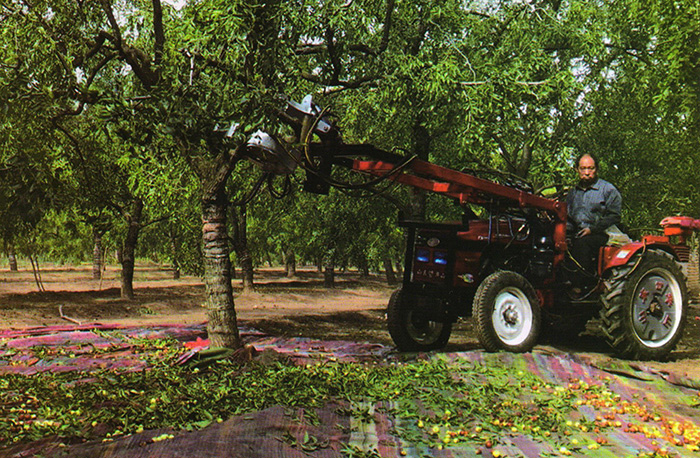 该机与拖拉机配套,采用进口马达驱动,主要使用于红枣、核桃、橄榄、椰子、坚果、板栗等果实的采摘作业,它是一种高效的果实采收设备,效率高、易操作,每分钟可收获2颗树的果实。